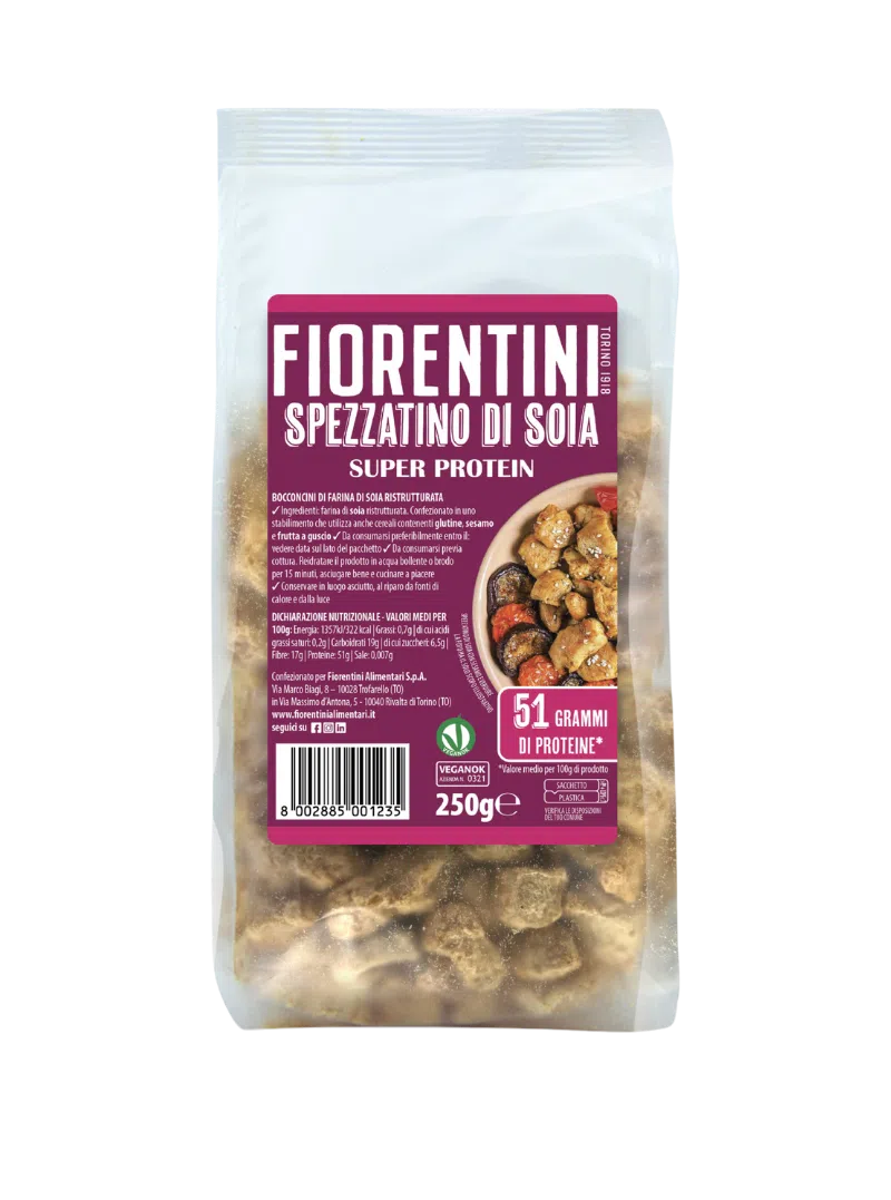 Per queste nostre specialità 100% vegetali utilizziamo solo farina di soia accuratamente selezionata. Fonte di fibre, ad alto contenuto di proteine e poveri di grassi, le “Delizie di Soia” Fiorentini sono ideali come sostituto della carne per la preparazione di gustose portate e saporite pietanze.