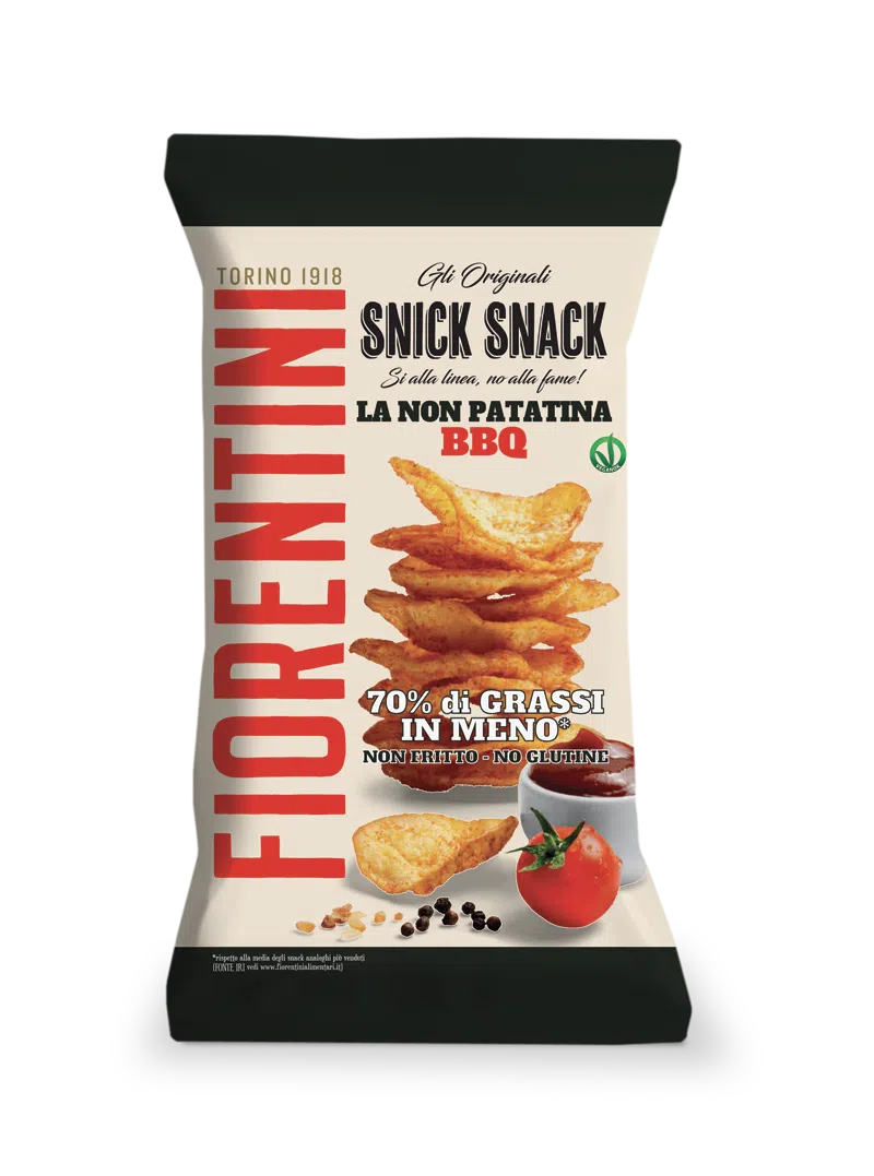 Snack estrusi utilizzati nella comparazione con il prodotto Snick Snack – La Non Patatina al BBQ Fiorentini riguardo al contenuto ridotto di grassi: