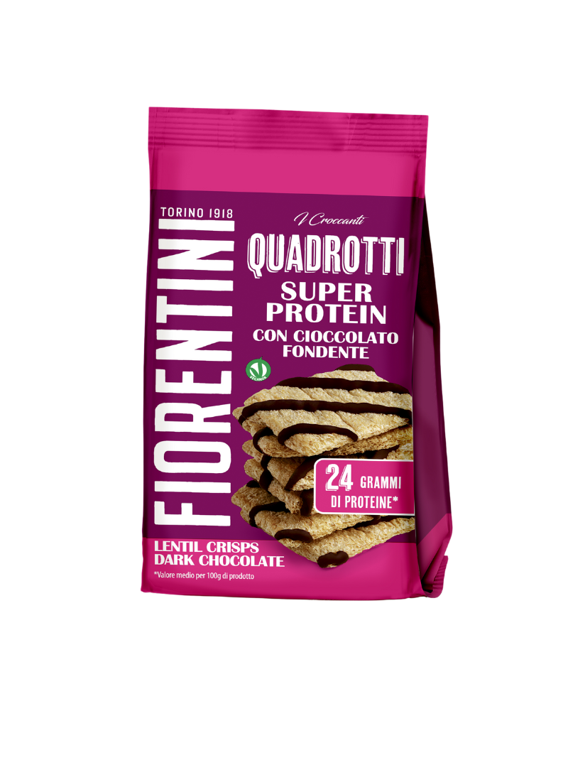 I Quadrotti Super Protein sono cialde a base di lenticchie rosse, legumi ricchi di proteine vegetali, ricoperte da irresistibile cioccolato fondente.